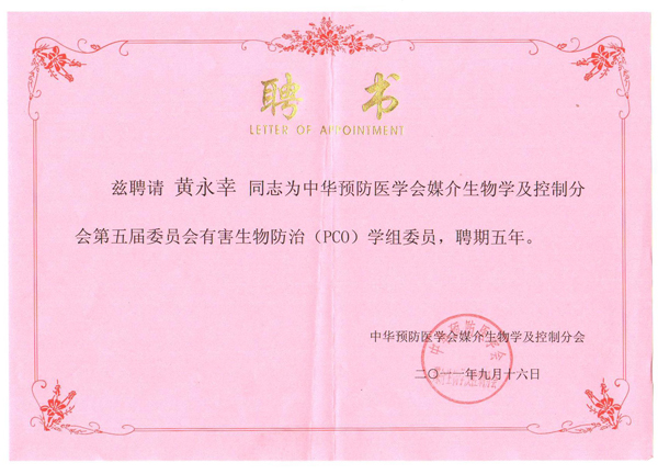 2011年9月16日公司總經(jīng)理黃永幸先生當(dāng)選中華預(yù)防醫(yī)學(xué)會(huì)媒介生物學(xué)及控制分會(huì)第五屆委員會(huì)有害生物防治(PCO)學(xué)組委員。
