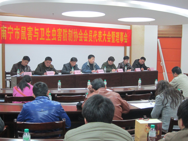 2012年元月9日,南寧市鼠害與衛(wèi)生蟲害防制協(xié)會(huì)在南寧市衛(wèi)生局召開了協(xié)會(huì)理事及全體會(huì)員大會(huì),會(huì)議審議并全體通過了協(xié)會(huì)工作報(bào)告、財(cái)務(wù)報(bào)告及新一屆協(xié)會(huì)領(lǐng)導(dǎo)選舉??祪艄究偨?jīng)理黃永幸先生當(dāng)選新一屆協(xié)會(huì)副會(huì)長(zhǎng)。圖為南寧市衛(wèi)生局長(zhǎng)湯曉斌、愛衛(wèi)辦常務(wù)副主任盧世偉、安愛萍會(huì)長(zhǎng)(原南寧市疾控中心黨委書記)、愛衛(wèi)辦副主任許茂松(協(xié)會(huì)副會(huì)長(zhǎng))、副會(huì)長(zhǎng)馮向陽(廣西自治區(qū)疾控病媒專家)、副會(huì)長(zhǎng)黃永幸、秘書長(zhǎng)費(fèi)百江在主席臺(tái)就座。